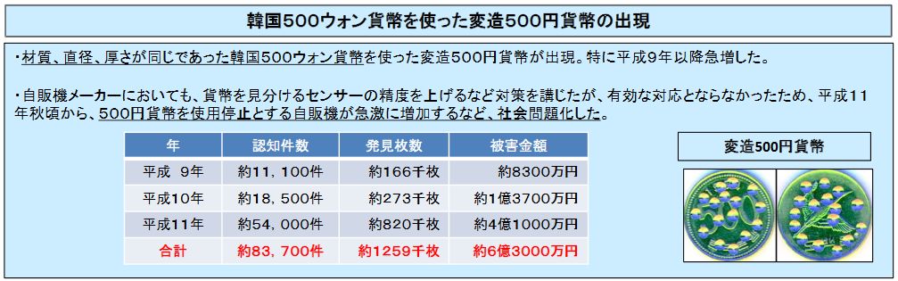 一般流通硬貨において、額面金額500円の硬貨は日本の硬貨で最高額であるばかりでなく、世界でも有数の高額面硬貨である[3][注 1]。このことが韓国の500ウォン硬貨など、低額面の硬貨による大量の通貨変造事件(後述)を招き、2000年(平成12年)には緊急改鋳を余儀なくされた[3]