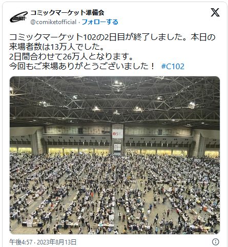 コミケ99~101は、新型コロナウイルスの感染拡大の影響で、来場者の人数を制限したが、コミケ102では人数制限を廃止。入場に関する規制が大幅に緩和された。会場内の安全確保を目的とした人数制限対策は継続し、一日あたり十数万人の来場を見込んでいる。13日まで。
