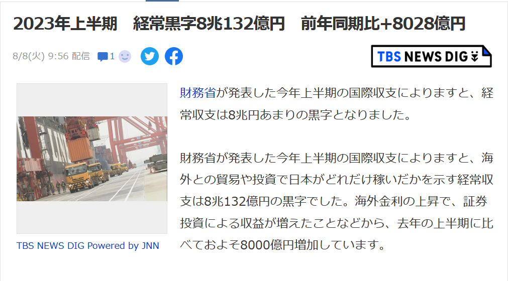 一般国民「2023年上半期 経常黒字8兆132億円 前年同期比+8028億円」