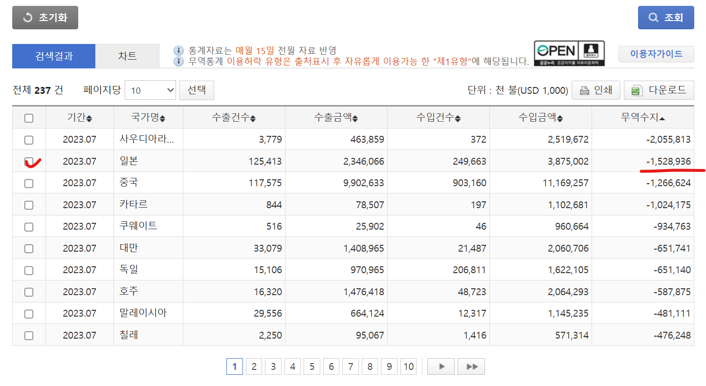 韓国・産業通商資源部が発表した7月の輸出入動向によると、韓国の対日貿易赤字は15億3000万ドル(約2217億2225万円)で対中貿易赤字(12億7000万ドル)を上回り、原油を輸入する中東地域に次ぐ2位を記録した。