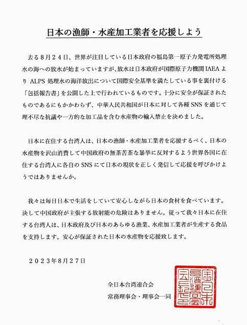 声明文には、「日本に在住する台湾人は、日本の漁師・水産加工業者を応援するべく、日本の水産物を沢山消費して中国政府の無茶苦茶な暴挙に反対するよう世界各国に在住する台湾人に各自のSNSにて日本の現状を正しく発信して応援を呼びかけようではありませんか」などと記されていた。