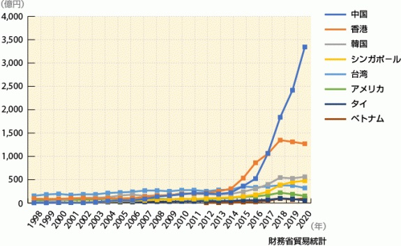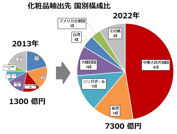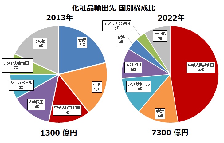 中国の場合、日本からの化粧品輸入額が、2013年には、182億円だったのが、2022年には、約3400億円にまで増えている。10年で10倍以上って、とてつもないことだよ。この上さらに中国人旅行客が日本で買って帰る分が加わるから、実質的には数百億円増えてしまう。