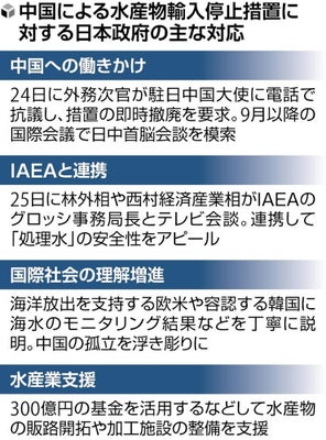 中国は、科学的根拠を示さないまま、24日に輸入停止措置を決めた。日本政府は同日、駐日中国大使に電話で抗議し、即時撤廃を要求した。外務省幹部は「中国は、振り上げた拳の下ろし方が分からなくなっているのだろう」と指摘する。