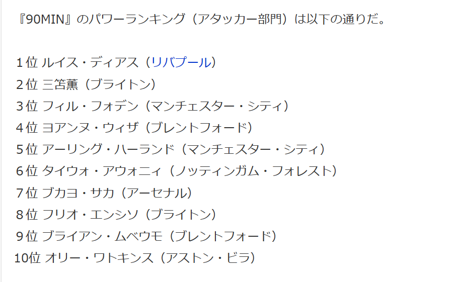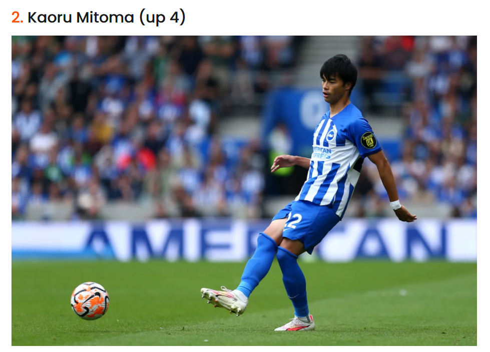 同メディアは、英国の『90MIN』が作成したパワーランキング(アタッカー部門)の順位に着目。「昨シーズンにセンセーションを起こした日本のアラッカー、カオル・ミトマ薫(ブライトン)がプレミアリーグのパワーランキングで2位に浮上した」と報じている。