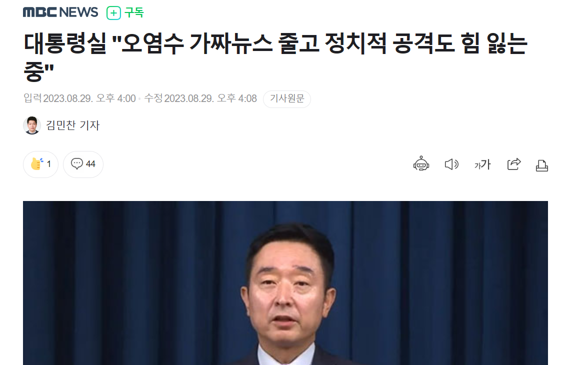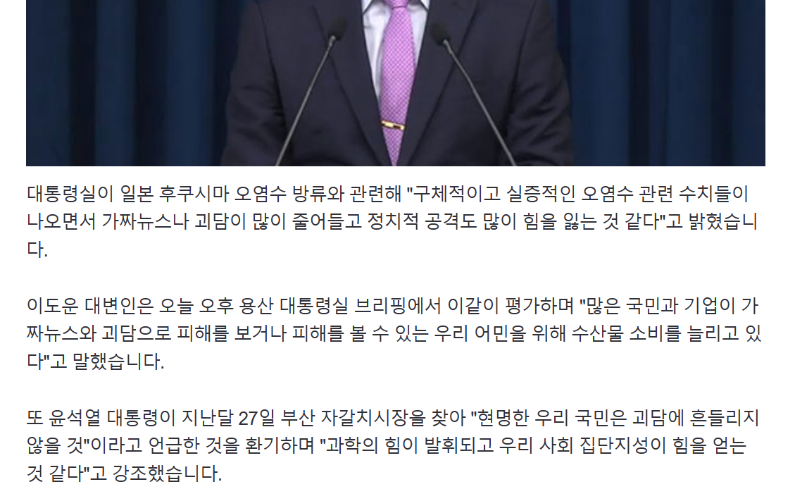 大統領室が日本の福島汚染水の放流と関連して「具体的で実証的な汚染水関連数値が出てきて偽ニュースや怪談が大幅に減り、政治的攻撃も大きく力を失っているようだ」と明らかにしました。