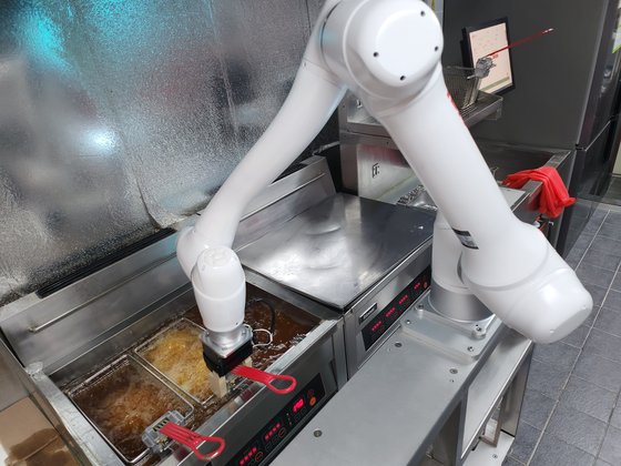今月26日午後、ソウル松坡区(ソンパグ)にあるロバートチキン直営店。店長のA氏(31)がチキンを箱詰めする間、店長のそばでは「ロボットアーム」がデリバリー・アプリで入ってきた注文内訳をリアルタイムで認識した後、「1番セクション、チキンの調理始めます」と報告していた。続いて、手慣れた動きで衣がついたチキンをフライヤーに入れた。