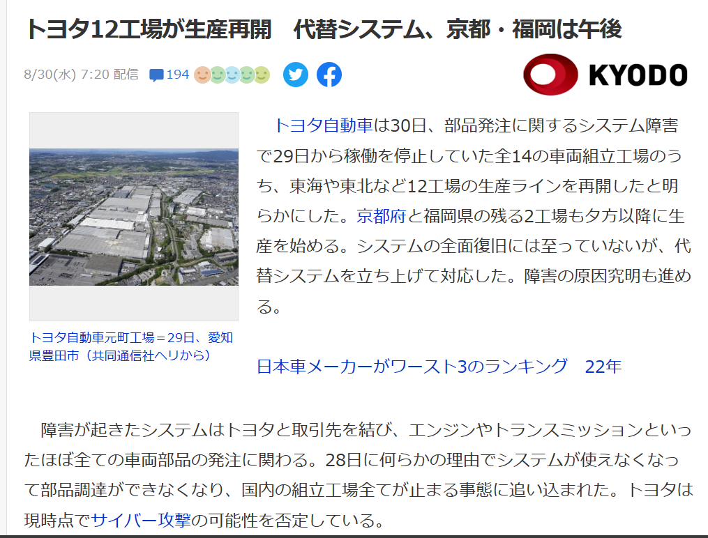 トヨタ12工場が生産再開 代替システム、京都・福岡は午後