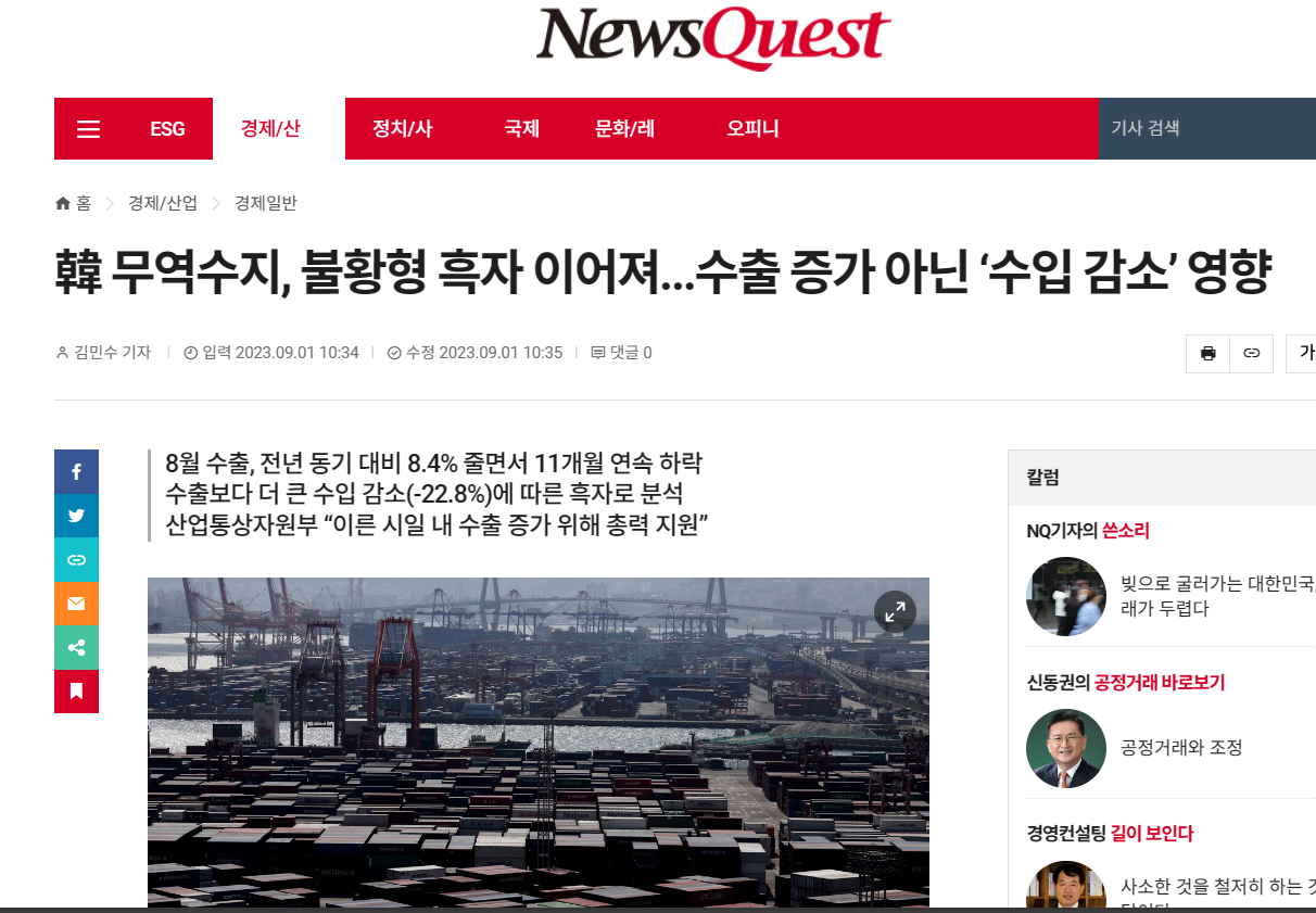 韓国貿易収支、不況型黒字続く···輸出増加ではなく「輸入減少」の影響