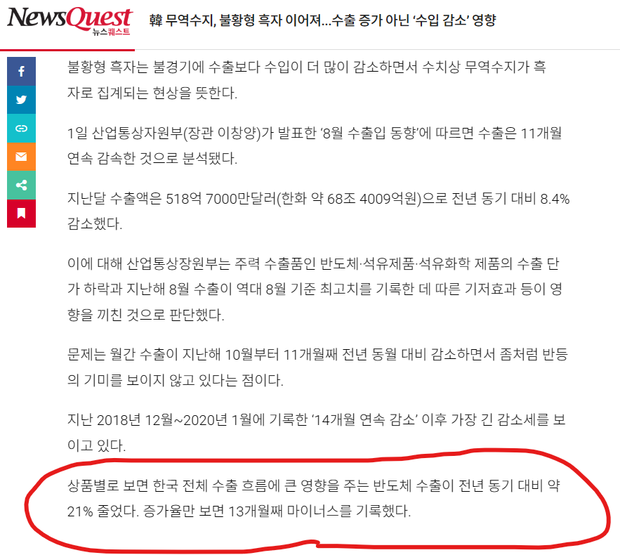 商品別に見れば、韓国全体の輸出の流れに大きな影響を与える半導体輸出が前年同期比約21%減少した。