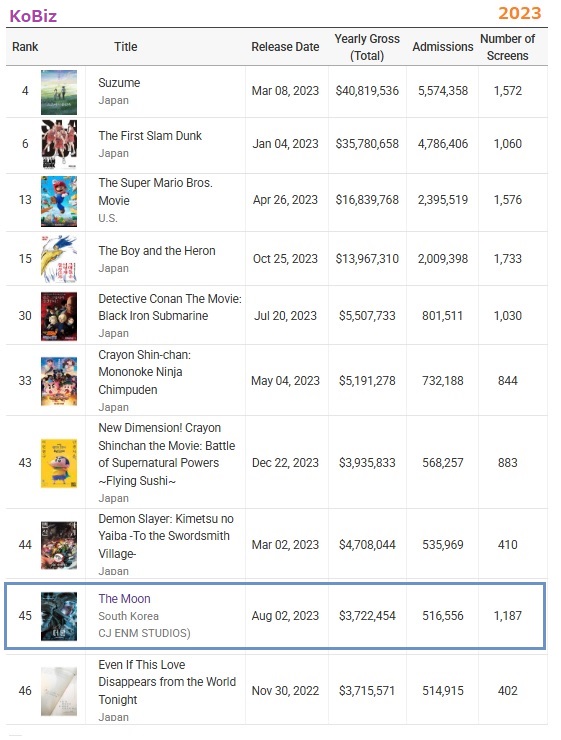 因みに『名探偵コナン:黒鉄の魚影』は韓国だけで77万人を集め、約8.2億円の興行収入。