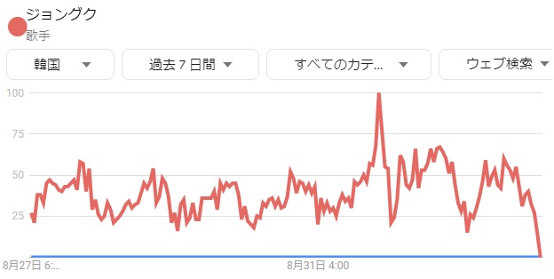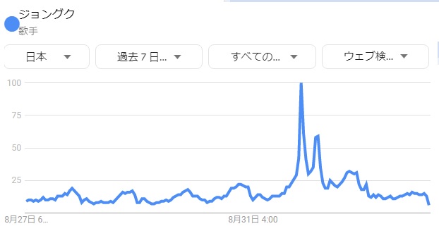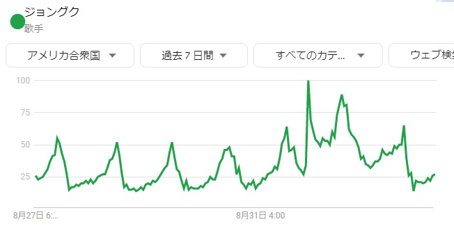 日変動と関係なく急激に立ち上がるピークは、大勢のファン(及び工作員)が動画が公開される時刻を知っていて、一斉に再生し始めるから。これは日本、韓国、アメリカのそれぞれに見られる。短時間のうちに複数回再生させられる人数の方が少ないので、直ぐに急激に下がって、鋭いピークを形成する。