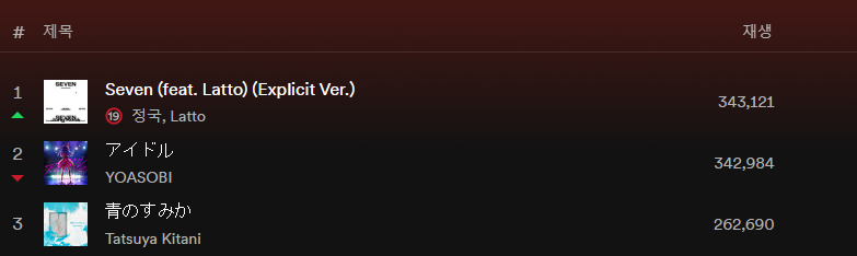 1名無し2023/09/02(Sat) 06:33:09ID:UwMDE3NzQ(1/1)NG報告BTS 멤버 Jungkook의 노래가 공개된지 거의 2개월이 다 됐는데오늘 일본 음악 차트 Spotify에서 1위가 됐다이전까지는 계속 2위였는데 Yoasobi를 넘고 1위가 됐다일본인은 왜 이렇게 BTS에 열광하는걸까?타국 아이돌에 이렇게 진심으로 환호하는 것을 보면 신기하다>>2>>3>>6>>11>>17>>20>>34>>35>>37>>39>>48>>50>>56>>61>>62>>630