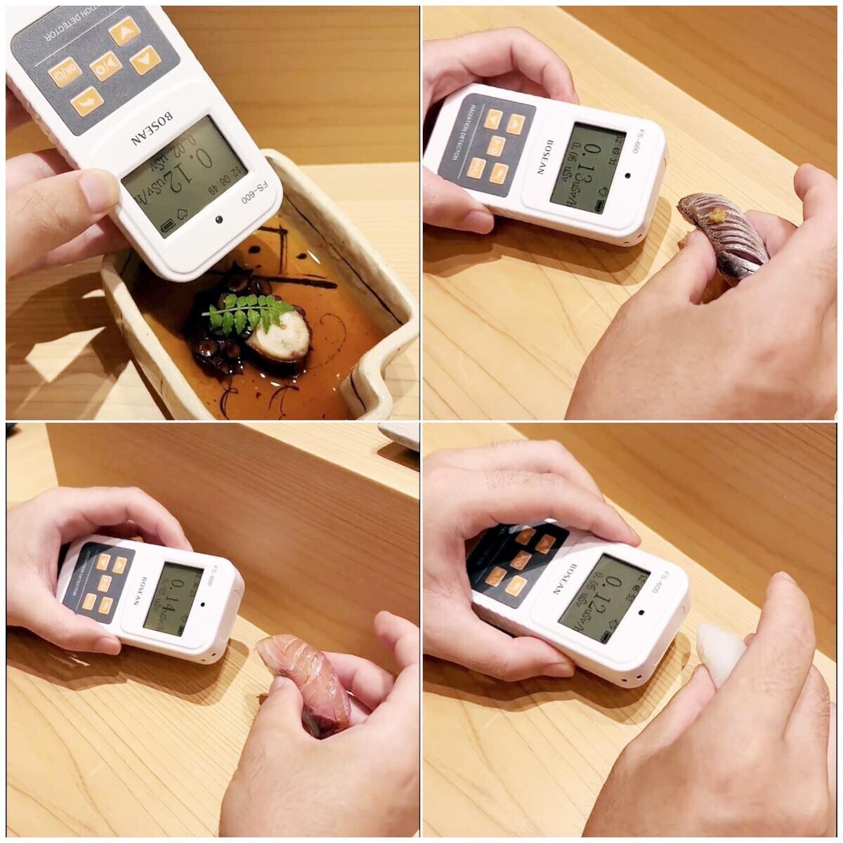 日本の高級すし店で一つひとつ放射線を測定する中国人