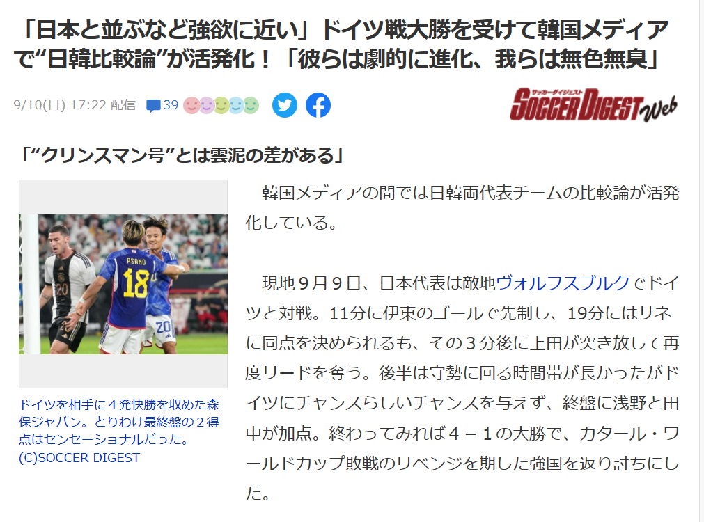 アウェーでの鮮烈なる快勝劇を受けて、韓国全国紙『東亜日報』は「日本がドイツに4-1で大勝。ワールドカップ後に退化する韓国との差をさらに広げる」と銘打ち、次のように論じている。