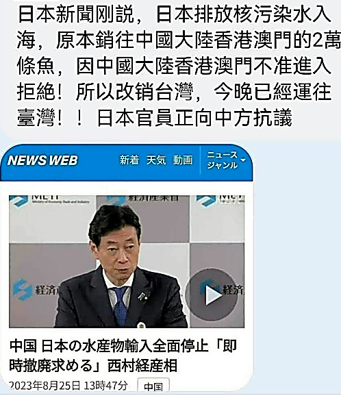 西村康稔・経済産業相が8月25日に開いた記者会見を報じたNHKニュースを改ざんした偽情報。中国語で「中国や香港、マカオに輸出予定だった2万匹の魚が台湾に運ばれた」と虚偽の説明が付けられていた