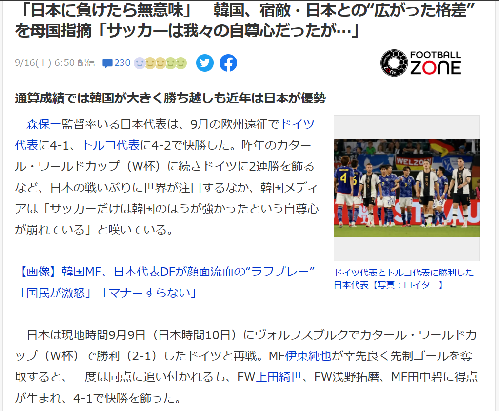 森保一監督率いる日本代表は、9月の欧州遠征でドイツ代表に4-1、トルコ代表に4-2で快勝した。昨年のカタール・ワールドカップ(W杯)に続きドイツに2連勝を飾るなど、日本の戦いぶりに世界が注目するなか、韓国メディアは「サッカーだけは韓国のほうが強かったという自尊心が崩れている」と嘆いている。