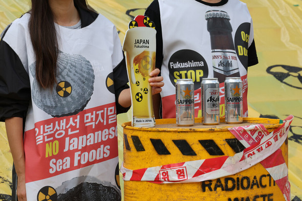 韓国の市民団体や環境団体が18日、東京電力福島第1原発の処理済み汚染水の海洋放出中止を求めるキャンペーンを北東部・江原道束草市の港周辺で展開した