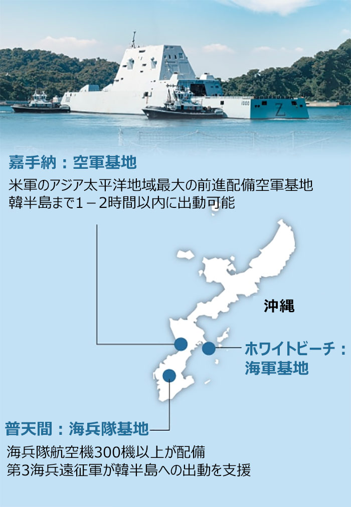 沖縄の艦隊支援部隊が常駐するホワイトビーチ海軍基地は、韓半島有事に沖縄に駐留する米海兵隊の拠点となっている。沖縄に配備されている在日米軍第3海兵隊機動軍は韓半島有事に最も早く投入される大規模増援米力の一つだ。