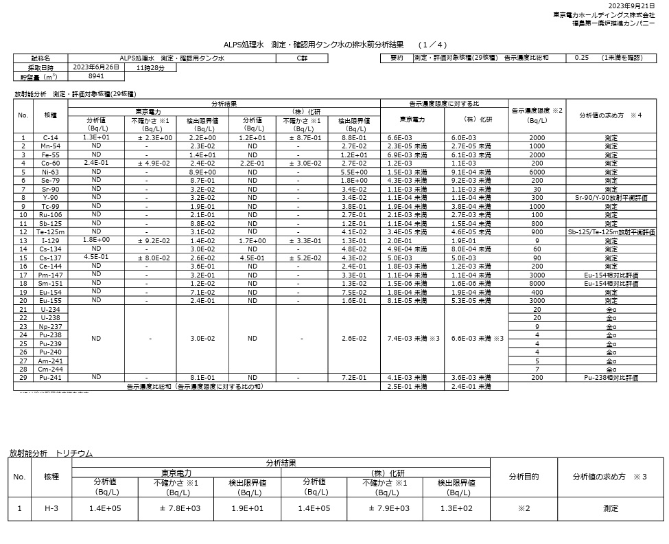 東京電力が23日に公表した放流前試料分析結果によると、東京電力は「測定・確認用タンクC群」の汚染水から放射性物質の炭素14、セシウム137、コバルト60、ヨウ素129等の4種の放射性物質を確認した。測定・確認用タンクは多核種除去設備(ALPS)で浄化した汚染水を放流する前に分析して保管する設備で、タンクC群には2回目の放流対象の汚染水が入っている。