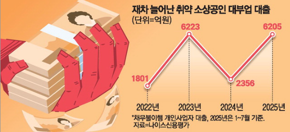 米国が高金利基調を長期間維持し、韓国も高金利が持続する可能性が高いだけに、自営業者の債務問題は韓国経済の大きな負担になりかねない。韓国銀行は先月の金融安定状況報告書で「自営業者向け融資の質が全般的に低下しており、『再出発基金』などを通じ、脆弱債務者の債務再編を促進しなければならない」とし、「中長期的には正常債務者の自発的債務償還および負債構造転換へと誘導する必要がある」と指摘した。景気低迷と消費不振に自営業者の貸付業貸出残額が半年ぶりに3倍近く急増した。 制度圏金融から押し出され、不法私金融に移る小商工人も大きく増えたことが明らかになり、脆弱層金融安全網の構築が急がれたという指摘が出ている。