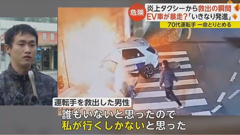 「車がいきなり急発進した」EVタクシーが建物に衝突し炎上 男性が駆け寄り運転手を救出する瞬間映像 韓国・釜山