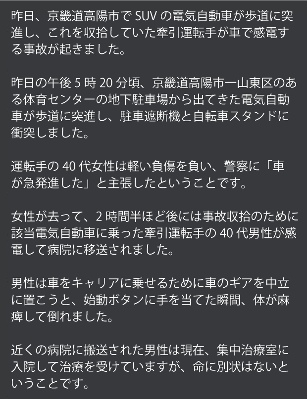 事故車に乗って始動ボタンに触れた瞬間に感電して麻痺して倒れ、近くの病院のICU送りになったそうです。