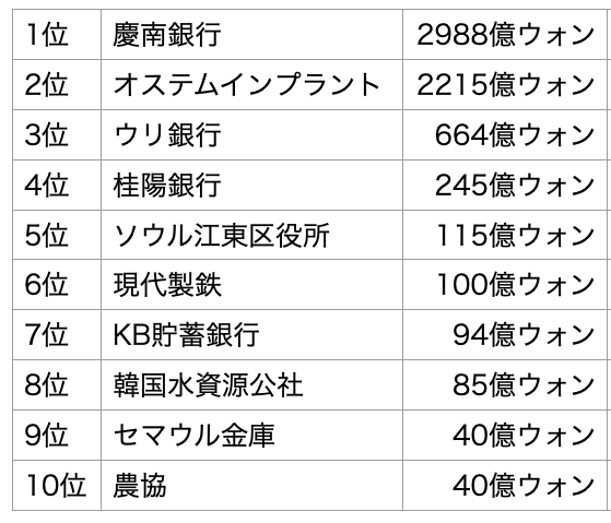 天下一横領大会、新記録更新!--。韓国金融監督院は9月20日、慶南銀行の不動産投資担当行員のL氏(50)が13年間で銀行の資金2988億ウォン(約332億円)を横領していたと発表した。それを受け、インターネット上にそんなコメントが書き込まれた。過去最高額だった。「新チャンピオン」慶南銀行に続いたのは、昨年2215億ウォン規模の横領があったオステムインプラント、ウリィ銀行(707億ウォン)、啓洋電機(246億ウォン)などだった。ランキングは真偽確認が必要だが、慶南銀での横領額が金融業界で過去最高であることだけは間違いない。