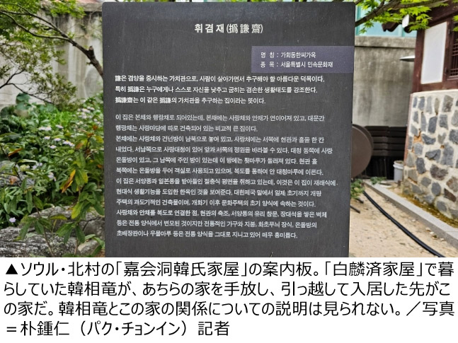 ところが、こうした名称の裏にはおかしな論理が隠れている。旧第一銀行は「朝鮮貯蓄銀行」が本来の名前。あの「韓氏家屋」の韓氏とは韓相竜(ハン・サンリョン)だ。その通り、東洋拓殖株式会社専務や漢城銀行専務を務めた代表的な親日派だ。「白麟済家屋」の元の住人もこの韓相竜だった。だが、韓相竜のことは隠している。なぜ? 「日帝残滓(ざんし)」であって「親日派の名前だから」
