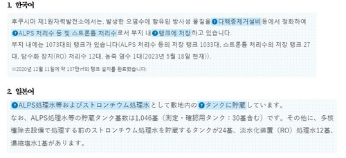 多核種除去設備(ALPS)で処理した水の状況に関するページで、韓国語版ではALPS処理水等の貯蔵タンクは1033基で、タンク総数は1073基(5月18日現在)と記載されている。一方、日本語版では基準の日付なしにALPS処理水等の貯蔵タンク数が1046基となっており、その他のタンク数を合計すると計1083基となる。