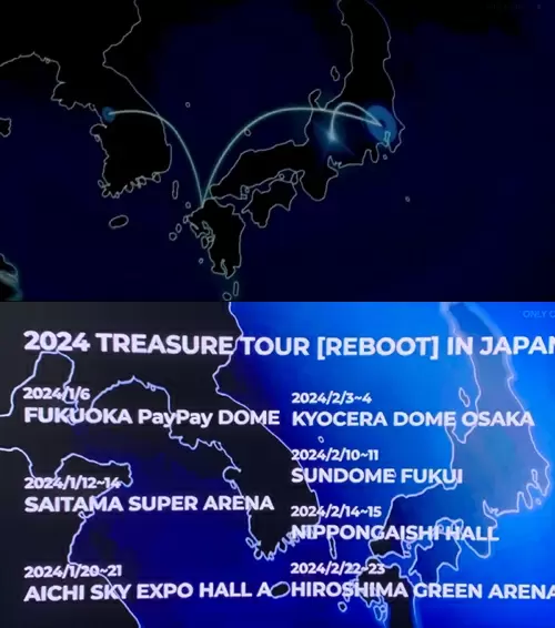 計画によると「TREASURE」は来年1月から2月まで福岡、大阪、埼玉など日本全域で公演を行う。ステージの液晶画面にはツアー日程と一緒に、韓国と日本などが入った地図イメージが一緒に公開された。