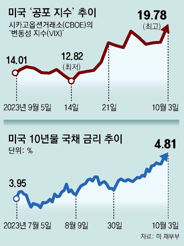 3日(現地時間)、世界債券金利の基準点となる米国10年満期の国債金利は、前日より0.12ポイント高の4.81%で、2007年8月以降最高値を更新した。30年満期の米国債金利も4.95%まで上昇し、5%台に迫った。金利高の懸念が広がり、「恐怖指数」と呼ばれるシカゴオプション取引所(CBOE)の変動性指数(VIX)は、前日より2.17ポイント(12.32%)上がった19.78で6ヶ月ぶりに最高値を更新した。VIXは、取引中一時「心理的防御線」とも言われる20を越えた。