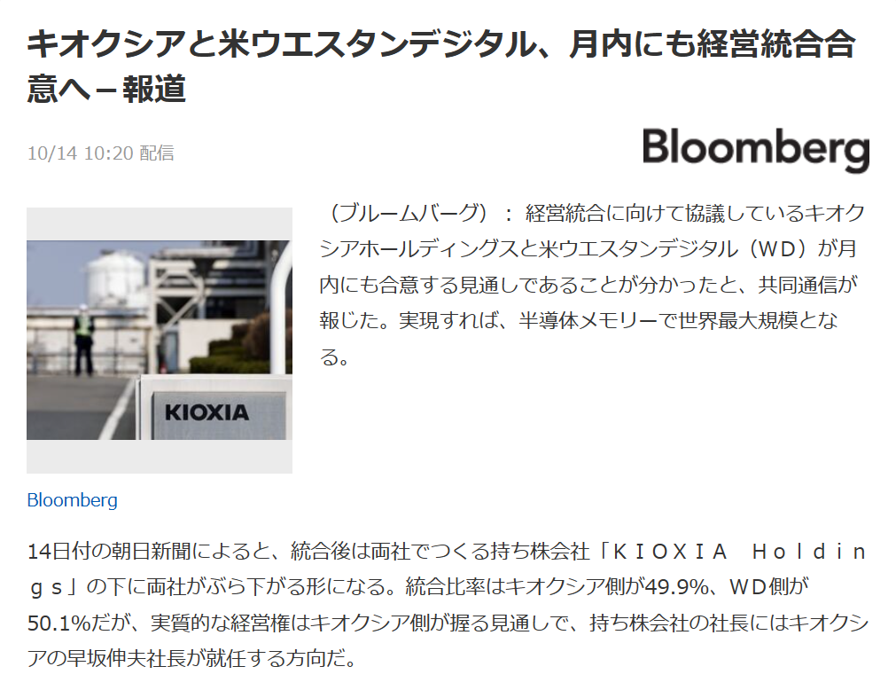 ジャパンタイムズ、米ブルームバーグ通信が2日までに伝えたところによると、キオクシアは最近、三井住友銀行など日本国内の銀行3行に最大2兆円の融資を要請したという。さらに、キオクシアの大株主であるベインキャピタルが企業合併のために資金5000億円の拠出を検討しているとも報じられ、両社の合併が秒読みに入ったとの見方が強まっている。