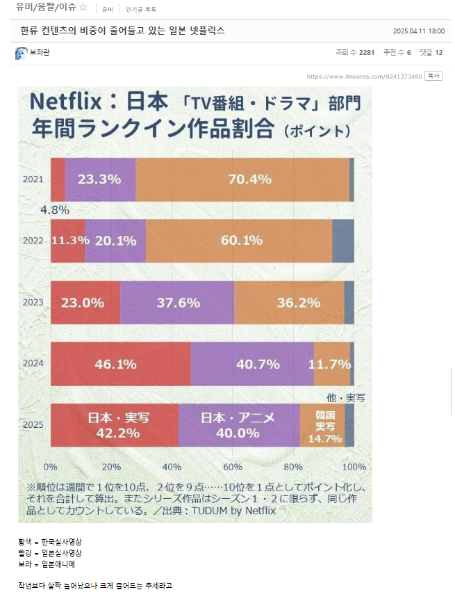 それと必死にNetflixが証拠nidaと主張しても70%から15%へ縮小している時点でKコンテンツの人気がない証左