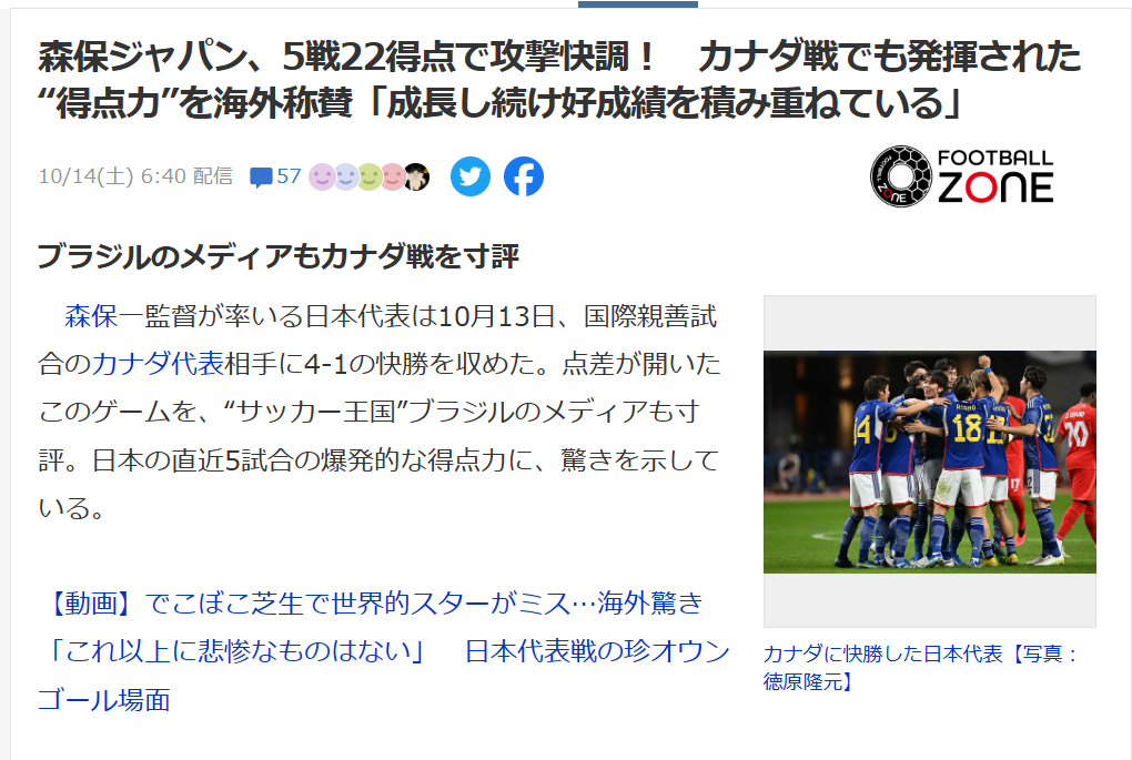 森保一監督が率いる日本代表は10月13日、国際親善試合のカナダ代表相手に4-1の快勝を収めた。点差が開いたこのゲームを、“サッカー王国”ブラジルのメディアも寸評。日本の直近5試合の爆発的な得点力に、驚きを示している。