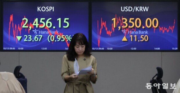 13日、総合株価指数(コスピ)も、前日比23.67ポイント(0.95%)下落した2,456.15で取引を終えた。個人が4225億ウォンを買い越し、指数防御に乗り出したが、外国人と機関が主導した売り越しに耐えるには限界があった。外国人投資家は先月18日以降、15取引日連続で売り傾向を続けた。コスダックも、12.55ポイント(1.50%)下がった822.94で取引を終えた。