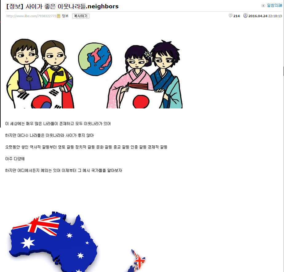 일베 정보 게시판에 게시되어 있는 스레드의 내용이지만 친한 나라 이웃나라 목록이다. 내용은 너무 길어서 생략했다. 호주-뉴질랜드 , 터키-아제르바이잔 , 이란-아프가니스탄 , 시리아 - 이라크 , 중국 - 파키스탄 , 벨기에 - 네덜란드 - 룩셈부르크 , 에스토니아 - 라트비아- 리투아니아 , 프랑스 - 모나코 , 이탈리아 - 산마리노 - 바티칸 , 오스트리아 - 헝가리 , 헝가리 - 폴란드 , 러시아 - 벨라루스 , 덴마크 - 노르웨이 , 핀란드 - 에스토니아 , 아르헨티나 - 우루과이 ,미국 - 캐나다 , 페루-볼리비아 [출처] [정보] 사이가 좋은 이웃나라들.neighbors [링크] http://www.ilbe.com/7938322773