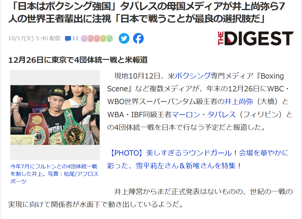 タパレスの母国メディアが井上尚弥ら7人の世界王者輩出に注視