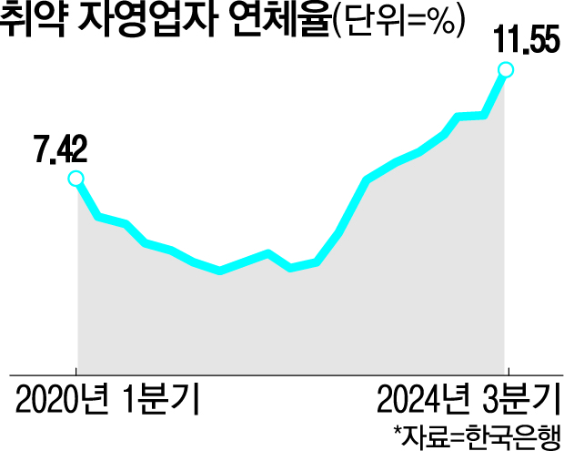 24日、韓国銀行の金融安定報告書によると、今年9月末の脆弱自営業者の延滞率は11.55%と集計された。 これは、脆弱自営業者の延滞率が史上最高に跳ね上がった2012年9月末当時、延滞率(13.9%)のぎりぎりまで急騰した数値だ。 1年前の昨年9月と比べては3.31%ポイント、3年前の2021年9月対比では7.61%ポイント上がった。
