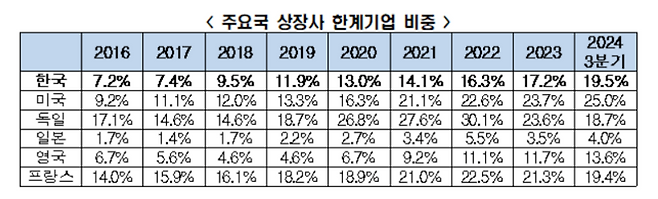 韓経協は、限界企業が主要国に比べて急速に増加したのは、景気不振の長期化に伴う販売不振・在庫増加で企業の収益性が大きく下がったからだと分析した。国内業種別にみると、不動産業(33.3%)、専門・科学・技術サービス業(24.7%)、卸売・小売業(24.6%)、情報通信業(24.2%)などの順で限界企業の割合が高かった。限界企業の割合は2016年7.2%から2024年7~9月期の19.5%に、12.3%p増加した。韓国の限界企業の比重上昇幅は米国(15.8%p)に次いで2番目に大きく、英国(6.9%p)、フランス(5.4%p)、日本(2.3%p)、ドイツ(1.6%p)は10%pを超えなかった。