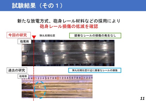 連続射撃の際、問題になるのが「弾丸との摩耗などによる砲身レールの損傷」「砲身レールの損傷による初速の低下」の2点だ。過去の研究では、弾丸の初期位置周辺の損傷が特に激しく、撃ち続けるたびに初速が低下する課題があった。