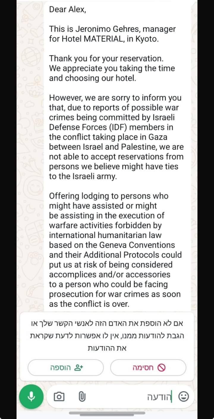 ホテルの支配人は観光客へのメッセージの中でこう述べた: 「イスラエルとパレスチナの間でガザで起きている紛争において、イスラエル国防軍(IDF)隊員による戦争犯罪の可能性が報告されているため、イスラエル軍と関係があると思われる方のご予約をお受けすることができません」