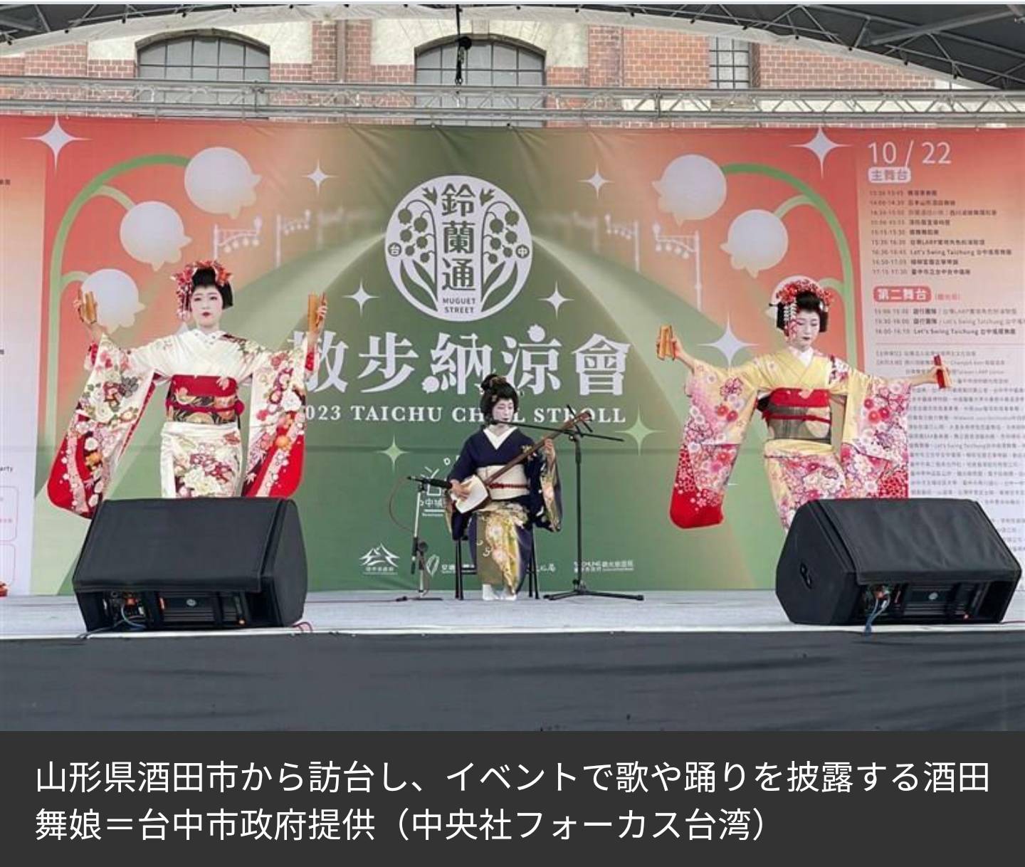 >日本統治時代に「すずらん通り」と呼ばれていた中部・台中市中心部のエリアで21、22両日、地方観光の発展を図るイベント「2023鈴蘭通散歩納涼会」が開かれた。仮装行列やマーケットが行われた他、同市と友好協力関係にある山形県から招待した酒田舞娘が歌や踊りを披露し、会場は日本統治時代に戻ったかのようなレトロな雰囲気に包まれた。>>126