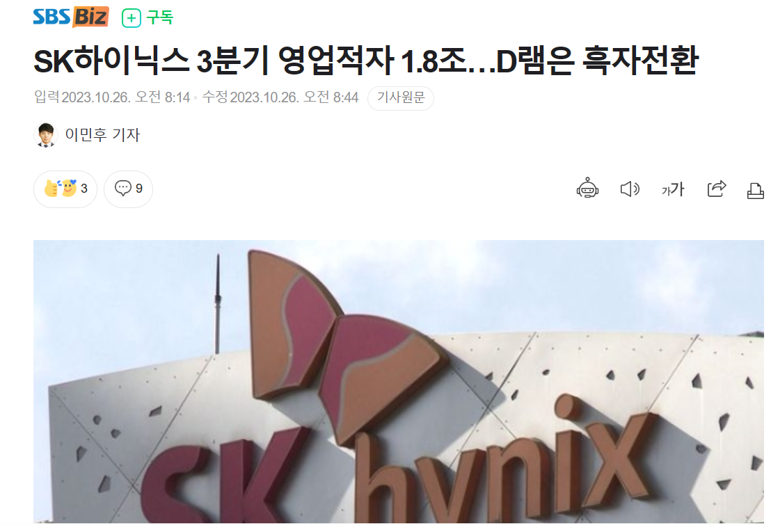 【ソウル聯合ニュース】韓国半導体大手のSKハイニックスが26日発表した2023年7~9月期の連結決算によると、営業損益は1兆7920億ウォン(約1990億円)の赤字(前年同期は1兆6605億ウォンの黒字)だった。4四半期連続で営業赤字を計上したが、広帯域メモリー(HBM)などの高性能製品を中心に売り上げが伸びたことで前四半期比では赤字額が縮小し、DRAM事業は2四半期ぶりに黒字に転じた。
