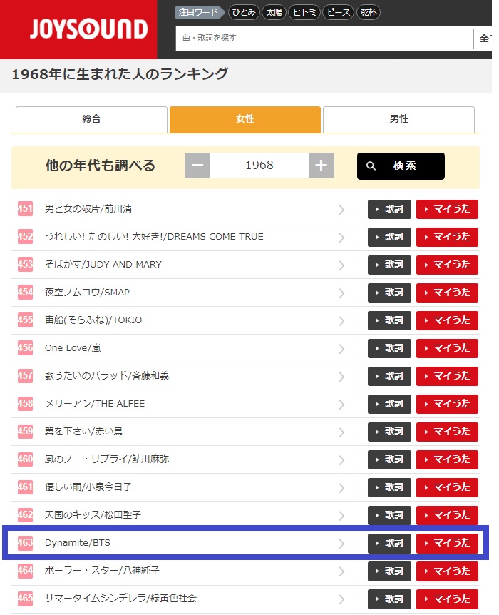 * 1968年生まれ(55歳)女性 BTS/Dynamite 463位