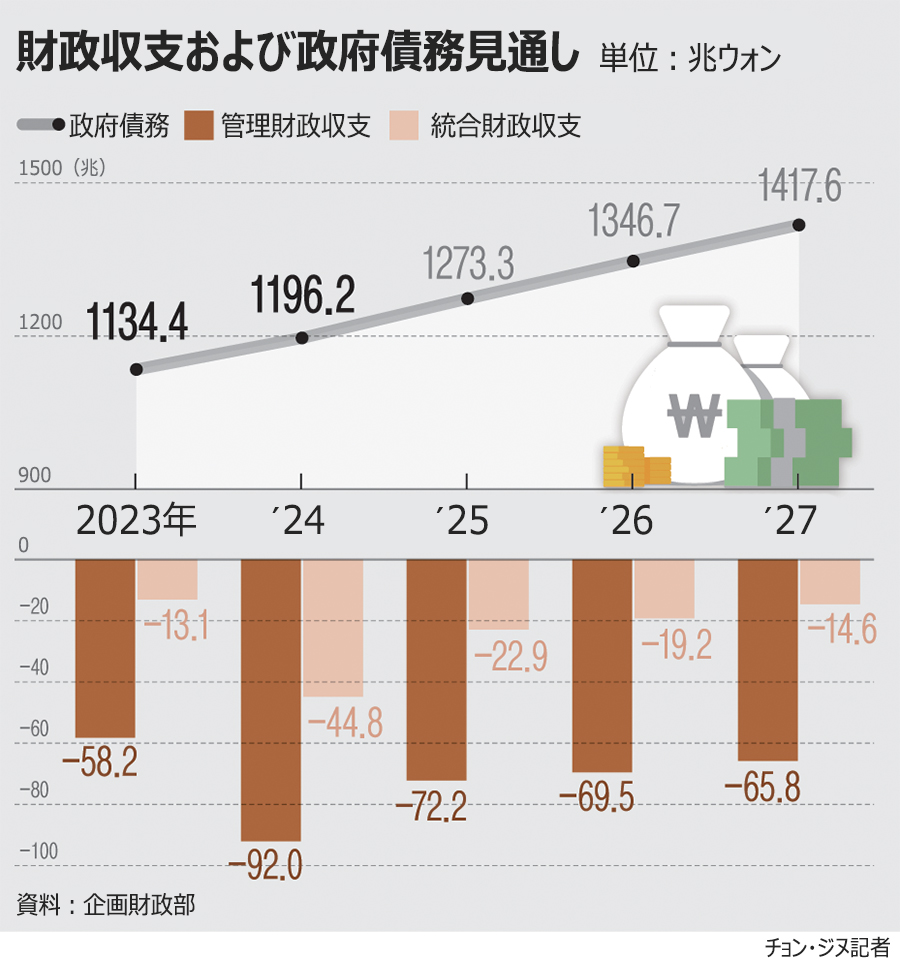 25日、本紙の取材を総合すると、企画財政部は20年9月、20~60年の長期財政予測の結果、60年時点で政府債務の対GDP比は64~81%と見込まれると発表した。当時は文在寅政権が借金を重ねて歳出を急激に増やしていた時期だった。文在寅政権は16年末に627兆ウォン(約70兆円)だった政府債務を21年末時点で971兆ウォンへと5年間で344兆ウォンも増やした。政府債務の対GDP比も36.0%から46.7%に悪化した。それにもかかわらず、文在寅政権はそれだけの歳出を行っても債務比率は大幅に高まることはないと主張したのだ。