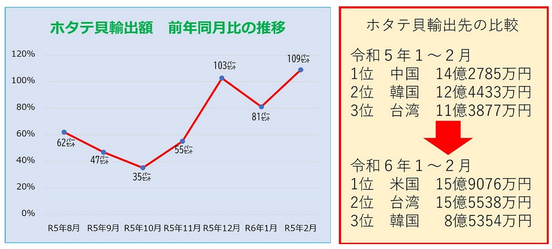ホタテはわが国の農林水産物・食品輸出で主力産品の一つです。その輸出額が、着実に回復しています。農林水産省が発表した統計によると、今年2月のホタテ輸出額は昨年同月比で9パーセント増となり、中国による輸入停止措置から約半年で、新たな販路開拓といった取り組みが実を結びつつあります。>>65