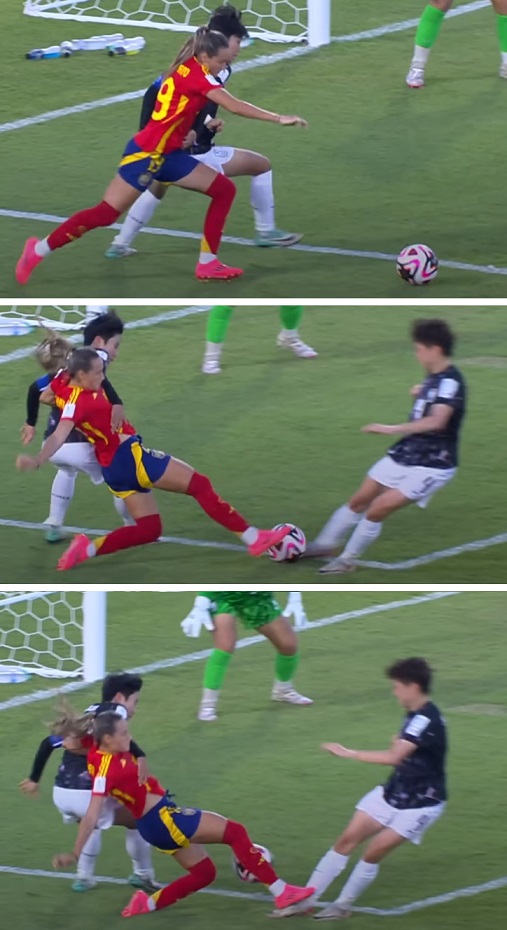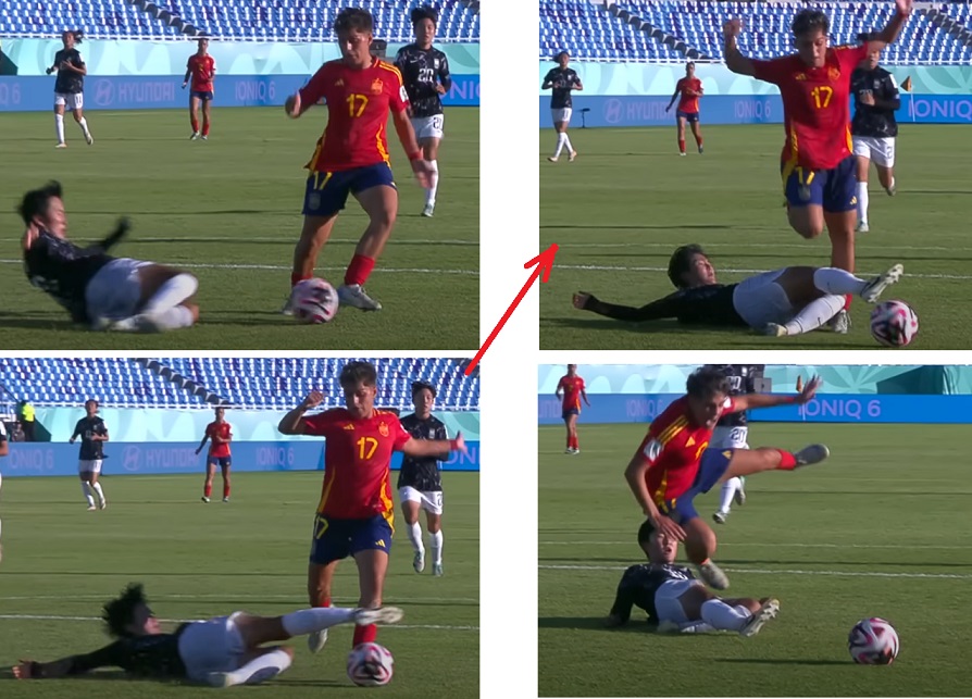 スペインの選手がうまく飛んで避けなかったら、大怪我してるじゃん。