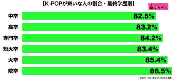 K-POPがもたらす最たる弊害はチョンのキャンセル文化(整形や自殺)とチョンへの警戒心の低下(最悪チョンとの結婚による家族間の亀裂発生)だと想像されるが、Twitterから知り得る限り実際20歳前後でもむしろ嫌韓となっているような気がする。