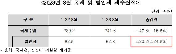 59兆ウォン規模に達する歴代級「税収パンク」事態の核心原因が政府の法人税減税政策という指摘が出た。27日、ジン・ソンミと共に民主党議員(企画財政委員会)は、国税庁が提出した「2018年~2022年課税標準別法人税決定現況」資料を分析した結果、今年減った国税収入中法人税減少分が40%を超えたと明らかにした。