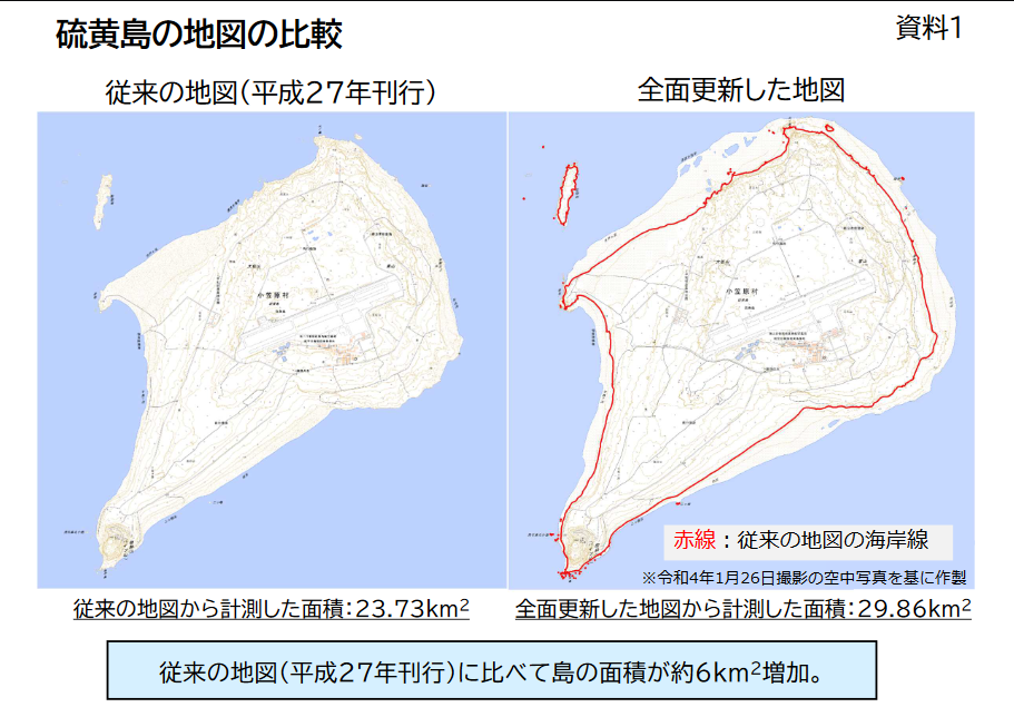 「2015年と比較して硫黄島の面積は約1.3倍となり、約6km2(東京ドーム約130個分)の面積が増加しました」>>2